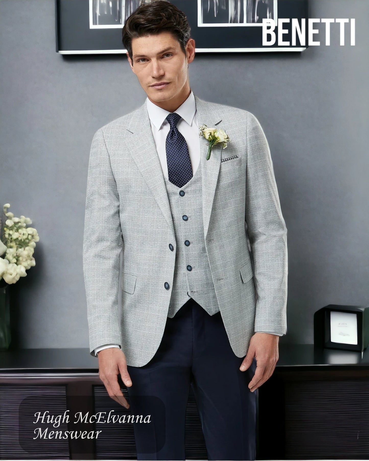 Introducing the Benetti PHILIP Silver Blazer, a refined men’s tweed suit jacket that blends classic tailoring with contemporary flair. Designed by the renowned Benetti menswear, this checked blazer is the perfect balance of tradition and trend, making it a standout piece for any well-dressed gentleman.